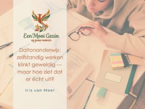 - Daltononderwijs: zelfstandig werken klinkt geweldig — maar hoe ziet dat er écht uit?Ik zal eerlijk zijn: van alle onderwijssoorten wist ik het minst van dalton. Montessori, jenaplan, vrijeschool — die hebben allemaal een herkenbaar imago. Dalton? Dat bleef voor mij lang een beetje vaag. Een school met weekplanningen en wat meer vrijheid, zo ongeveer. Dus ik ben erin gedoken. En het is interessanter dan ik dacht. Waar… Lees meer: Daltononderwijs: zelfstandig werken klinkt geweldig — maar hoe ziet dat er écht uit?